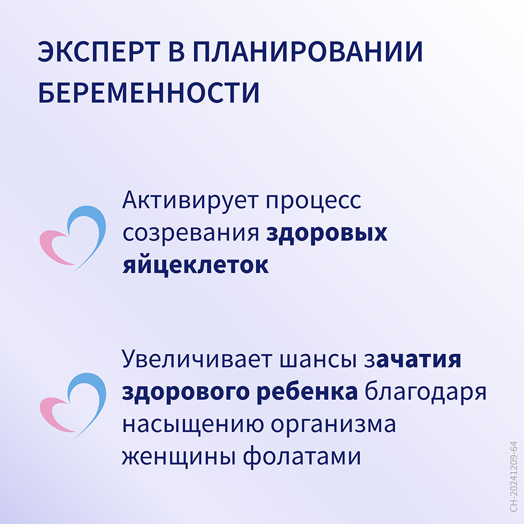 Метафолин® является современной формулой фолиевой кислоты, которая усваивается у всех женщин вне зависимости от генетических особенностей ферментов фолатного обмена. Насыщение организма фолатами улучшает процесс созревания и качество яйцеклеток, благодаря чему увеличиваются шансы зачатия здорового ребенка. Достаточная обеспеченность фолатами помогает снизить риск самопроизвольного прерывания беременности на ранних сроках и замершей беременности.