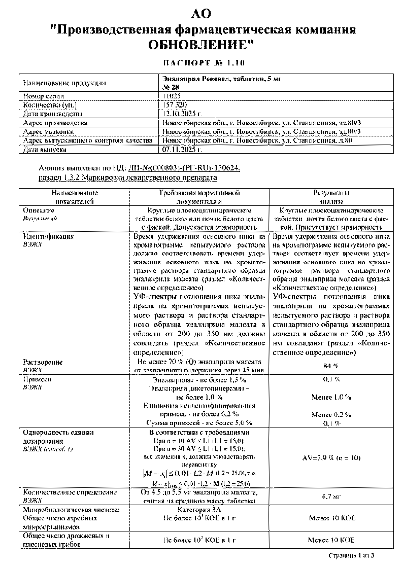 Сертификаты и лицензии “Эналаприл Реневал 5 мг 28 шт таблетки”