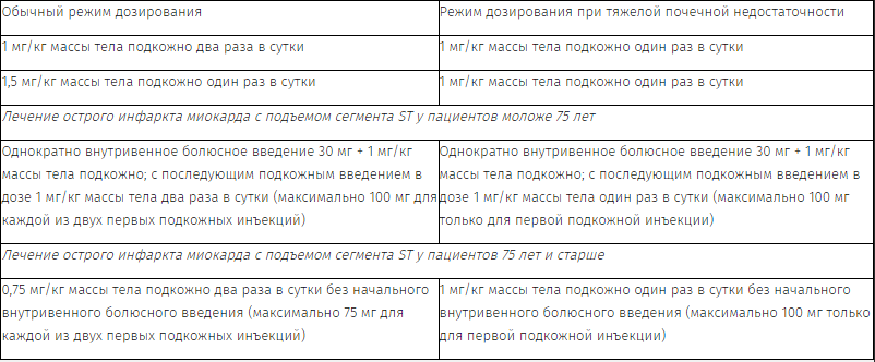 Режим введения эноксапарина натрия отличался в зависимости от показаний. При профилактике венозных тромбозов и эмболии при общехирургических и ортопедических операциях или у пациентов, находящихся на постельном режиме, вводилось 40 мг подкожно один раз в сутки. При лечении тромбоза глубоких вен с тромбоэмболией легочной артерии или без нее, пациенты получали эноксапарин натрия из расчета 1 мг/кг массы тела подкожно каждые 12 ч или 1,5 мг/кг массы тела подкожно один раз в сутки. При лечении нестабильной стенокардии и инфаркта миокарда без зубца Q доза эноксапарина натрия составляла 1 мг/кг массы тела подкожно каждые 12 ч, а в случае инфаркта миокарда с подъемом сегмента ST проводилось внутривенное болюсное введение 30 мг с последующим введением 1 мг/кг массы тела подкожно каждые 12 ч.