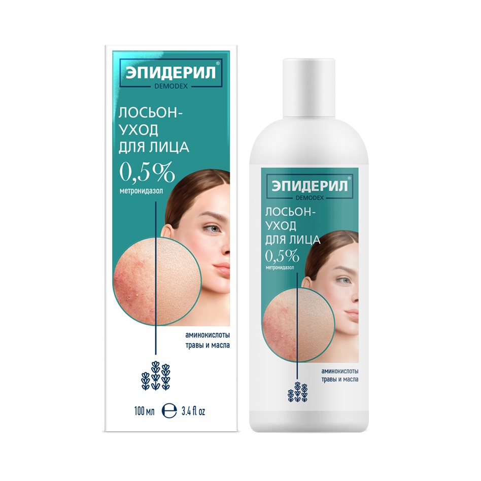 Лосьон-уход для лица «Эпидерил Demodex» с метронидазолом и травами бережно очищает проблемную кожу и наполняет ее энергией и силой.