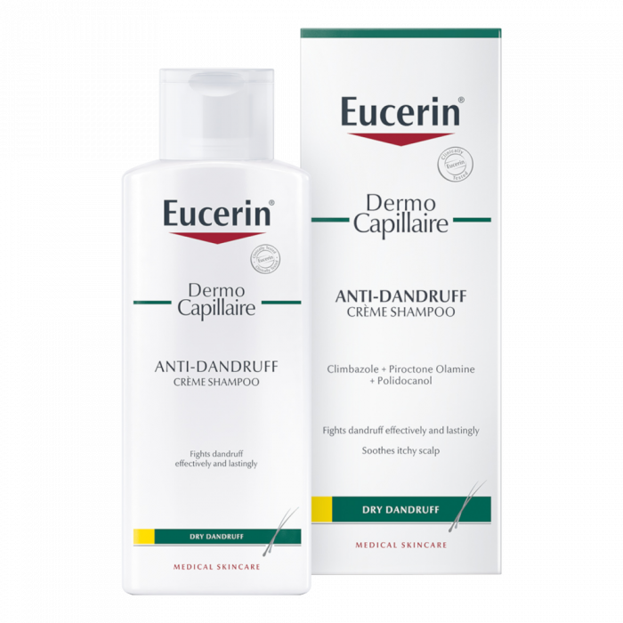 Шампунь-крем против перхоти Eucerin DermoCapillaire разработан специально для борьбы с сухой перхотью. Он нежно очищает волосы и кожу головы от белых хлопьев и чешуек, эффективно сокращая количество перхоти и контролируя ее образование. Его мягкая формула успокаивает кожу головы и снимает зуд уже с первого применения, а специальные кондиционирующие вещества придают волосам здоровый блеск, делая их мягкими и послушными.