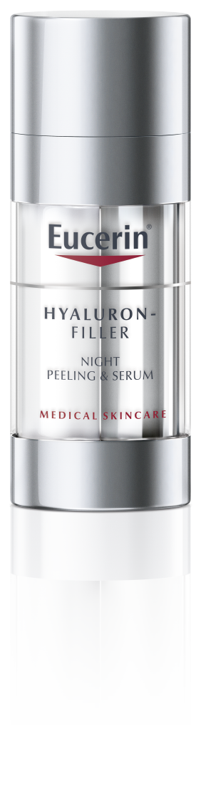 Дерматологи используют инъекции гиалуроновой кислоты и пилинги для омоложения стареющей кожи. Являющийся результатом вдохновения этими процедурами, двойная ночная сыворотка Eucerin HYALURON-FILLER сочетает в себе две мощные формулы, которые обеспечивают комплексное благоприятное действие, замедляющее старение:
