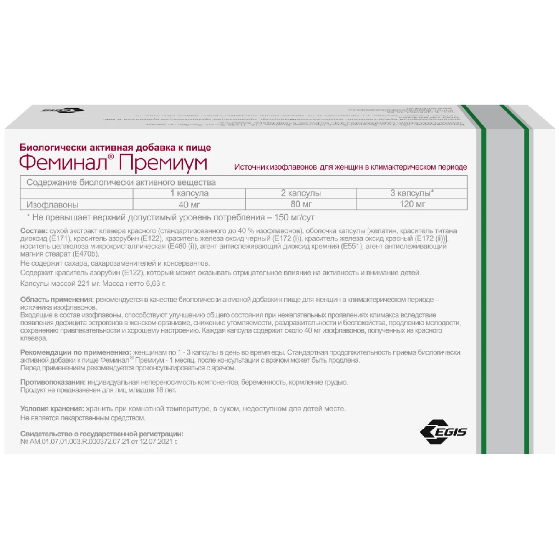Биологически активная добавка Феминал® предназначается для женщин, находящихся в периоде до и во время менопаузы. Капсулы изготовлены на основе изофлавонов, полученных из растения красный клевер. Каждая капсула содержит около 40 мг чистых изофлавонов.