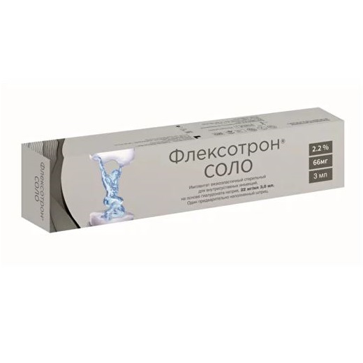 ФЛЕКСОТРОН® Соло – протез синовиальной жидкости, стерильный, прозрачный вязкоэластичный гель, содержащий гиалуронат натрия, получаемый методом бактериальной ферментации, в фосфатном буфере. Имплантат не содержит лекарственного средства для медицинского применения, материалов животного и (или) человеческого происхождения.