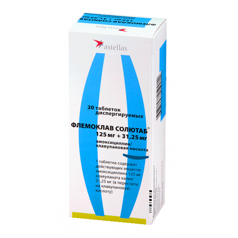 Детям младше 12 лет с массой тела до 40 кг назначают Флемоклав Солютаб® с меньшими дозировками: 125 мг + 31,25 мг; 250 мг + 62,5 мг; 500 мг + 125 мг.
