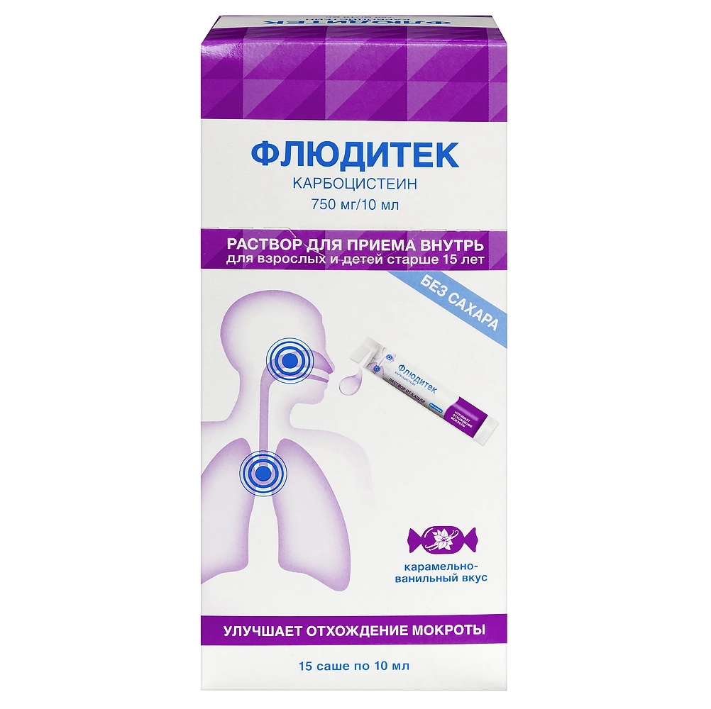 Каждое саше (10 мл) содержит 750,0 мг карбоцистеина.