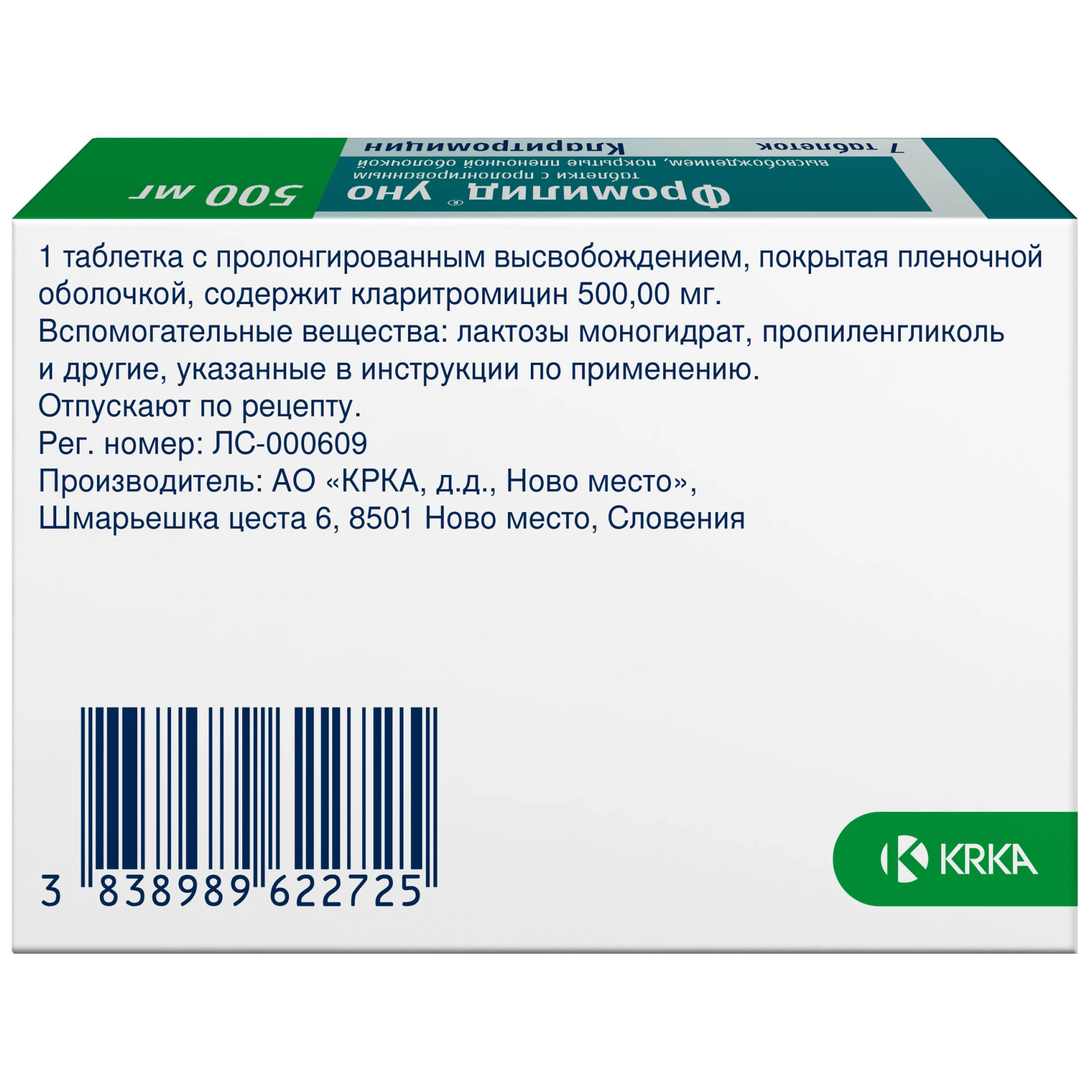 Действующее вещество: кларитромицин 500,00 мг