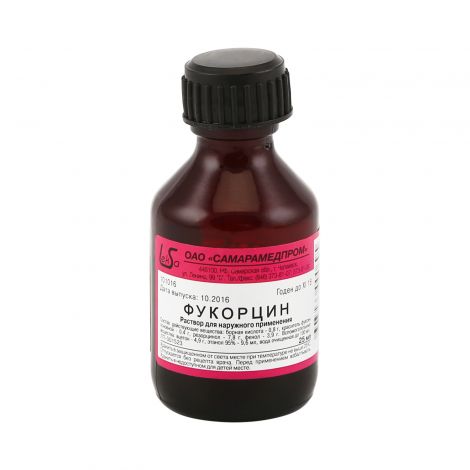 Активные вещества: краситель фуксин основной 0.4 г, борная кислота 0.8 г, фенол 3.9 г, резорцинол 7.8 г.