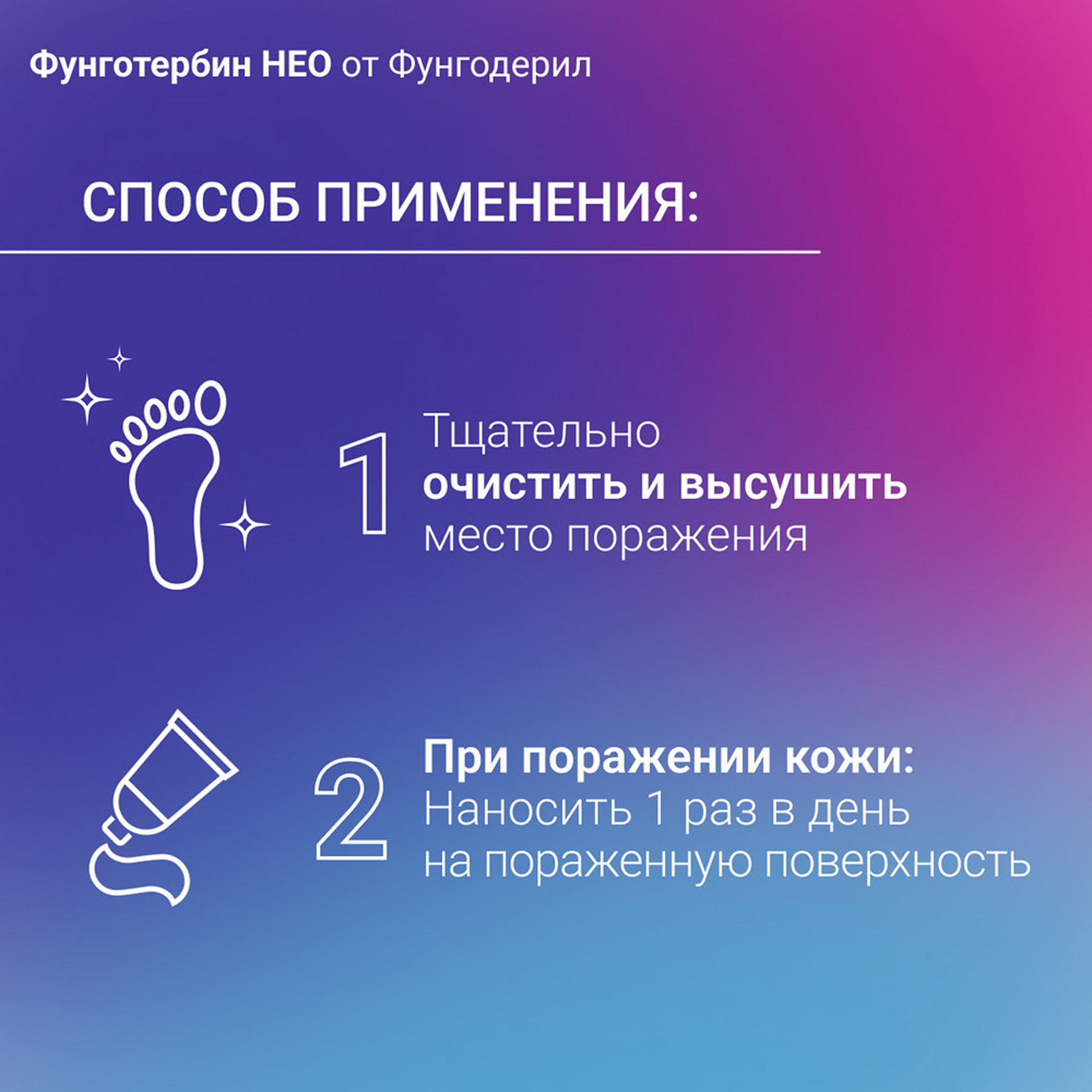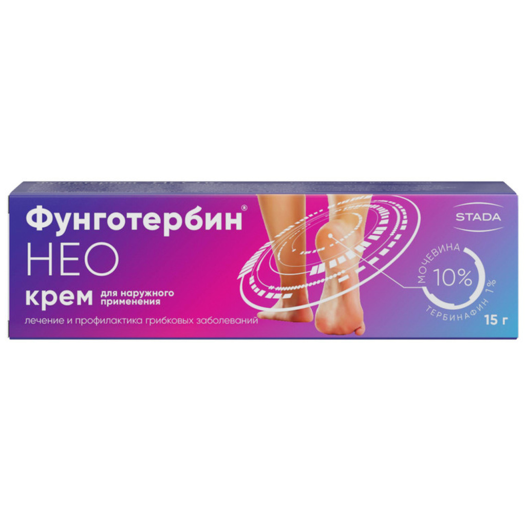 Противогрибковый препарат для местного применения. Тербинафин — активное вещество Фунготербина® НЕО, представляет собой аллиламин и обладает широким спектром противогрибкового действия. Тербинафин нарушает происходящий в грибах биосинтез эргостерола на ранних стадиях. Это ведет к дефициту эргостерола и к внутриклеточному накоплению сквалена, что вызывает гибель клетки гриба. Действие тербинафина осуществляется путем ингибирования фермента скваленэпоксидазы, расположенного на клеточной мембране гриба. Этот фермент не относится к системе цитохрома P450, поэтому тербинафин не оказывает влияния на метаболизм гормонов или других лекарственных препаратов. Тербинафин оказывает фунгицидное действие в отношении дерматофитов, плесневых и некоторых диморфных грибов. Активность в отношении дрожжеподобных грибов, в зависимости от их вида, может быть фунгицидной или фунгистатической. Мочевина — второй активный компонент Фунготербина® НЕО, обладает смягчающим, отшелушивающим и увлажняющим эффектом, способна повышать дерматопенетрантность (проникновение в кожу) и создавать высокие концентрации тербинафина в коже. Мочевина способствует связыванию воды и размягчению рогового слоя кожи. Фармакокинетика При местном применении крема всасывается менее 5% дозы, таким образом, системное действие препарата минимально. При однократном нанесении на поверхность кожи площадью 30 см2 в моче обнаруживается 3,5% дозы. Препарат быстро проникает в кожу и накапливается в сальных железах.