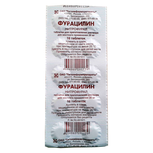 Местно, наружно в виде 0,02% свежеприготовленного водного раствора: непосредственно перед применением одну таблетку (20 мг фурацилина), растворяют в 100 мл дистиллированной или в теплой кипяченой воде. Для более быстрого растворения рекомендуется горячая вода. Затем раствор охлаждают до комнатной температуры.