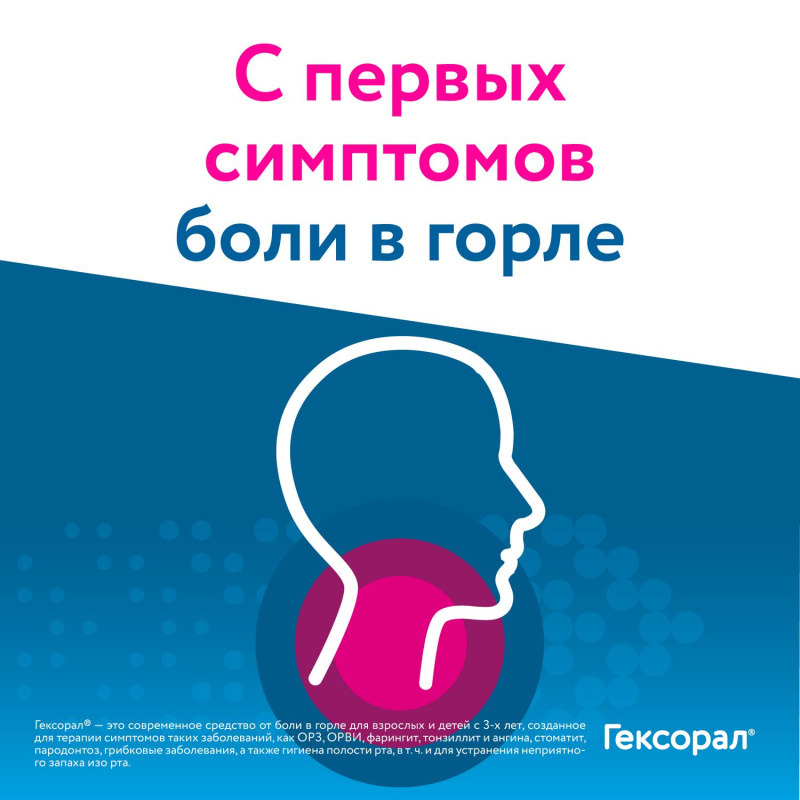 Гексорал® - это современное средство от боли в горле для взрослых и детей с 3-х лет, созданое для терапии симптомов таких заболеваний, как ОРЗ, ОРВИ, фарингит, тонзиллит и ангина, стоматит, пародонтоз, грибковые заболевания, а также гигиена полости рта, в т. ч. и для устранения неприятного запаха изо рта. Гексорал® способен бороться с большинством типов распространенных возбудителей инфекционных заболеваний полости рта и глотки: вирусами, бактериями, грибами и биопленками (1). Гексорал® проникает в очаг инфекции через 1-2 секунды (2). ОСНОВНЫЕ ПРЕИМУЩЕСТВА Линейка Гексорал® включает в себя: аэрозоль, раствор для полоскания полости рта и таблетки для рассасывания. Аэрозоль обладает антисептическим, противовирусным и противомикробным свойством. Гексорал® проникает в очаг инфекции через 1-2 секунды (2) и подходит для лечения боли в горле любой интенсивности взрослым и детям с 3х лет. Подходит для лечения боли в горле, простуды, першения, фарингита, тонзиллита, ангины. Семейный формат: Гексорал в семейной упаковке с 4 индивидуальными насадками. Теперь каждый член семьи, вне зависимости от возраста, точно будет знать и не перепутает «свою» насадку, а это значит, что при применении спрея инфекция не распространится от одного к другому. Европейское качество лекарства от боли в горле. Гексорал — оригинальный препарат, с проверенным качеством, который производится во Франции. ДРУГОЕ В состав препарата входят: Гексэтидин рекомендован (3) как средство для лечения детей с острым тонзиллитом Способ применения: Гексорал® распыляют в полости рта или глотке. С помощью аэрозоля можно легко и быстро обработать пораженные участки. Необходимо выполнить следующие действия: 1. Для начала наденьте на аэрозольный баллон насадку- распылитель и направьте ее конец на пораженный участок полости рта или глотки. 2. Обязательно держите флакон в вертикальном положении во время введения препарата. 3. Задержите ненадолго дыхание, надавите на головку насадки-распылителя и удерживайте ее в таком положении в течение 1–2 секунд. Это время соответствует введению однократной дозы препарата. 4. Если специалист не дал иных рекомендаций, средство применяется 2 раза в день – утром и вечером. 5. Длительность лечения должен определить специалист. ССЫЛКИ 1. Еще раз о термине «вирусно-бактериальная инфекция», А.С. Полякова, к.м.н. В.К. Таточенко, д.м.н., профессор, Научный центр здоровья детей, г. Москва, Медицинский совет, 2015 № 14 2. Согласно инструкции, аэрозоль распыляется в течение 1-2 секунд. Не является временем действия на симптомы. 3. Клинические рекомендации «Острый тонзиллит у детей», 2016 г.