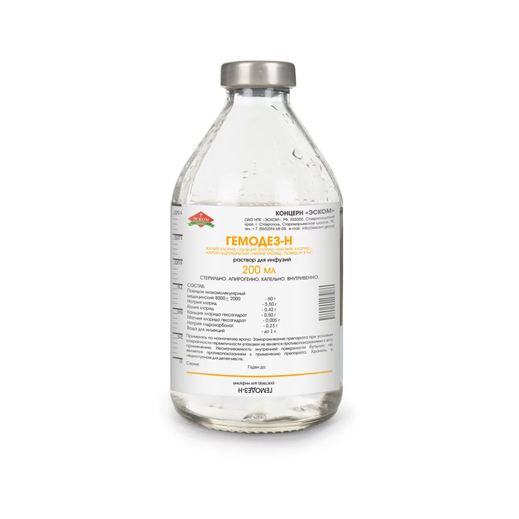 При медленном введении Гемодез-Н обычно осложнений не вызывает. Введение с повышенной скоростью может вызвать снижение артериального давления, тахикардию, затруднение дыхания и потребовать введения сосудосуживающих и сердечных средств, кальция хлорида. У отдельных больных возможно возникновение аллергических реакций, вплоть до развития анафилактического шока. В этих случаях следует немедленно прекратить инфузию, провести симптоматическую терапию (ввести антигистаминные, кардиотонические средства, глюкокортикоиды, вазопрессивные препараты).
