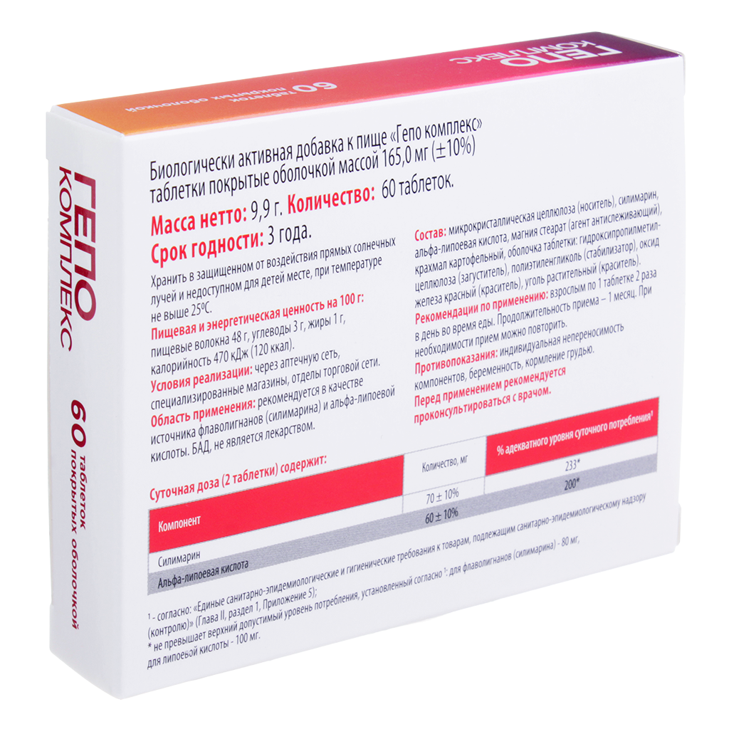 Силимарин (из плодов расторопши), альфа-липоевая кислота, Е460, крахмал картофельный, Е470, Е464, Е1521, Е172, Е153.