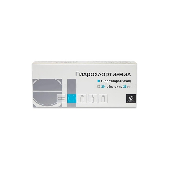 Действующее вещество: гидрохлоротиазида (в пересчете на 100% вещество) - 25 мг или 100 мг,
