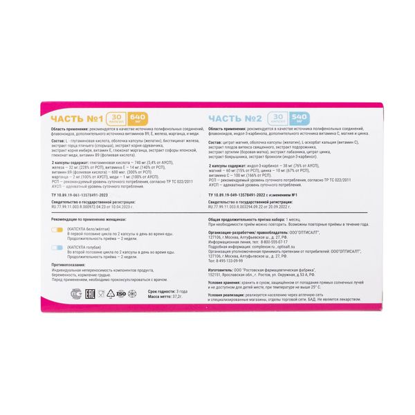 №2: экстракты подорожника, плодов витекса священного, боярышника, ортилии (боровая матка), брокколи (индол-3-карбинол), лабазника; витамин С; цитрат магния, цитрат цинка; оболочка капсулы: (желатин, красители Е171 и Е 132).