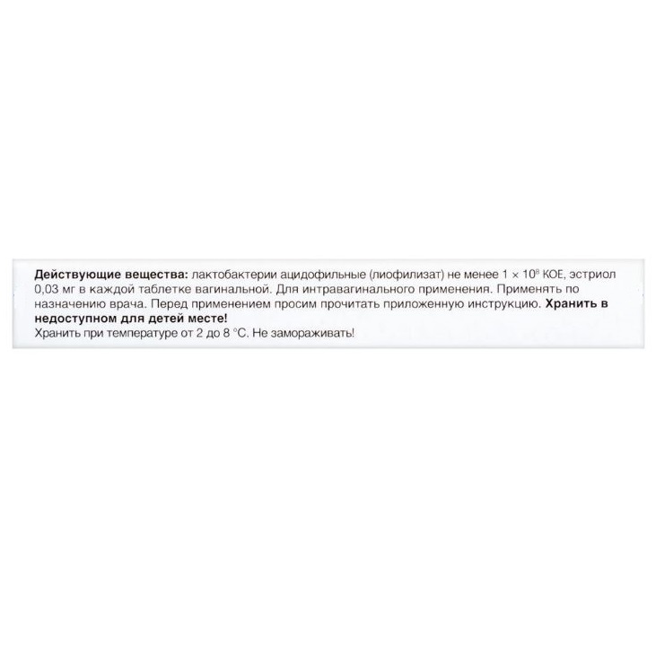 Действующие вещества: лактобактерии ацидофильные (лиофилизат) - не менее 1×108 КОЕ, эстриол - 0.03 мг.