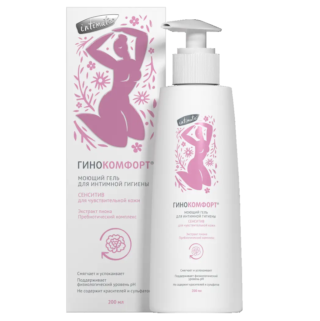ГИНОКОМФОРТ ГЕЛЬ - моющий гель для интимной гигиены женщин - подходит для чувствительной к внешним факторам кожи.