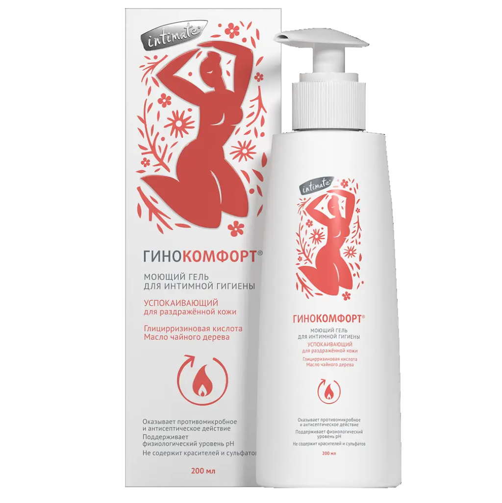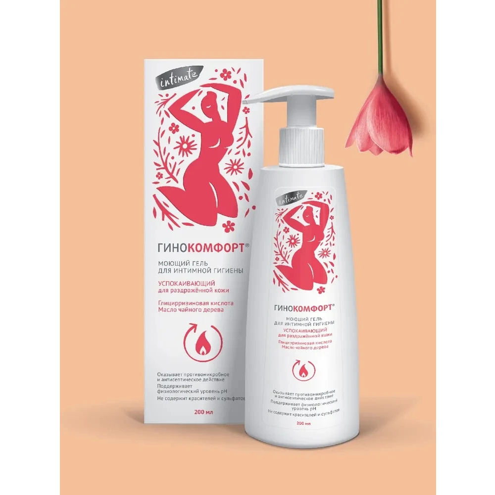 Синтетическое белье, гигиенические прокладки, частые депиляции и множество других факторов неизбежно влияют на состояние кожи и слизистой интимной зоны. Правильная гигиена часто позволяет избежать многих проблем. Вместо раздражения – комфорт и мягкость, вместо жжения – свежесть и чистота, вместо воспаления – баланс и защита. В составе успокаивающего геля ГИНОКОМФОРТ органично сочетаются 7 активных компонентов, направленных на поддержку интимного здоровье. Глицирризиновая кислота и пантенол в средстве для интимной гигиены успокаивают, смягчают кожу и слизистую, способствуя снятию раздражения и покраснения. Пироктоноламин и масло чайного дерева обладают выраженными противомикробными свойствами. Молочная кислота и пребиотический комплекс поддерживают физиологический уровень pH и нормализуют баланс микрофлоры женщины. Результат геля для интимной гигиены: деликатный уход за интимной зоной даже при воспалении, смягчение неприятных проявлений: раздражения, жжения, покраснения; поддержка баланса интимной флоры. Гель не содержит химических отдушек, красителей, сульфатов и иных раздражающих кожу компонентов. Средство подходит для ежедневного применения. ГИНОКОМФОРТ – деликатное решение интимных проблем.