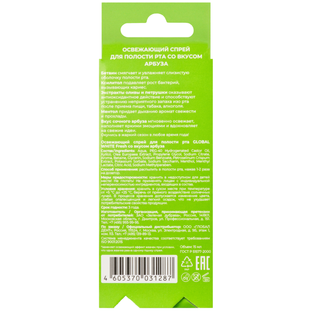 Global White Fresh 15 мл спрей для полости рта освежающий сочный арбуз