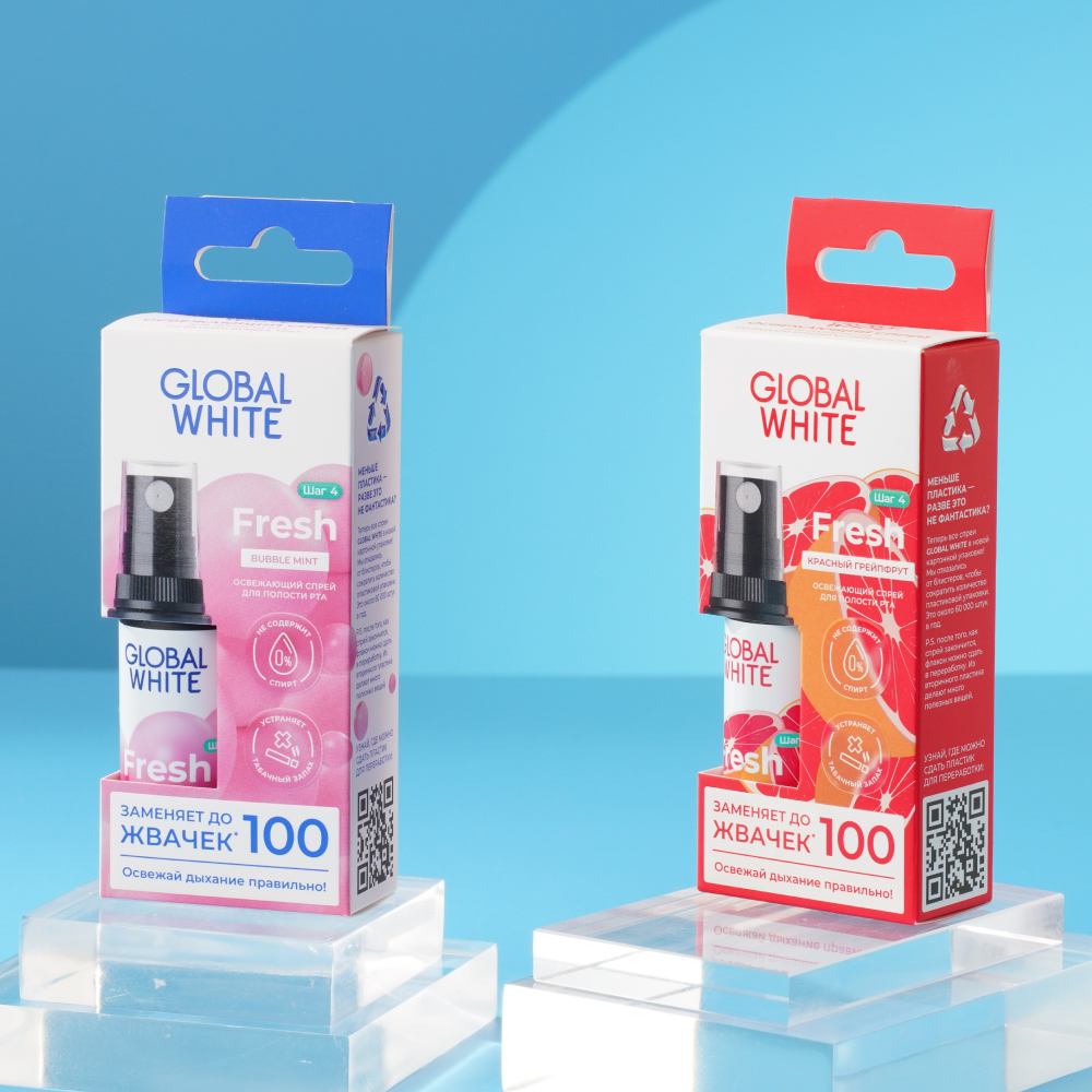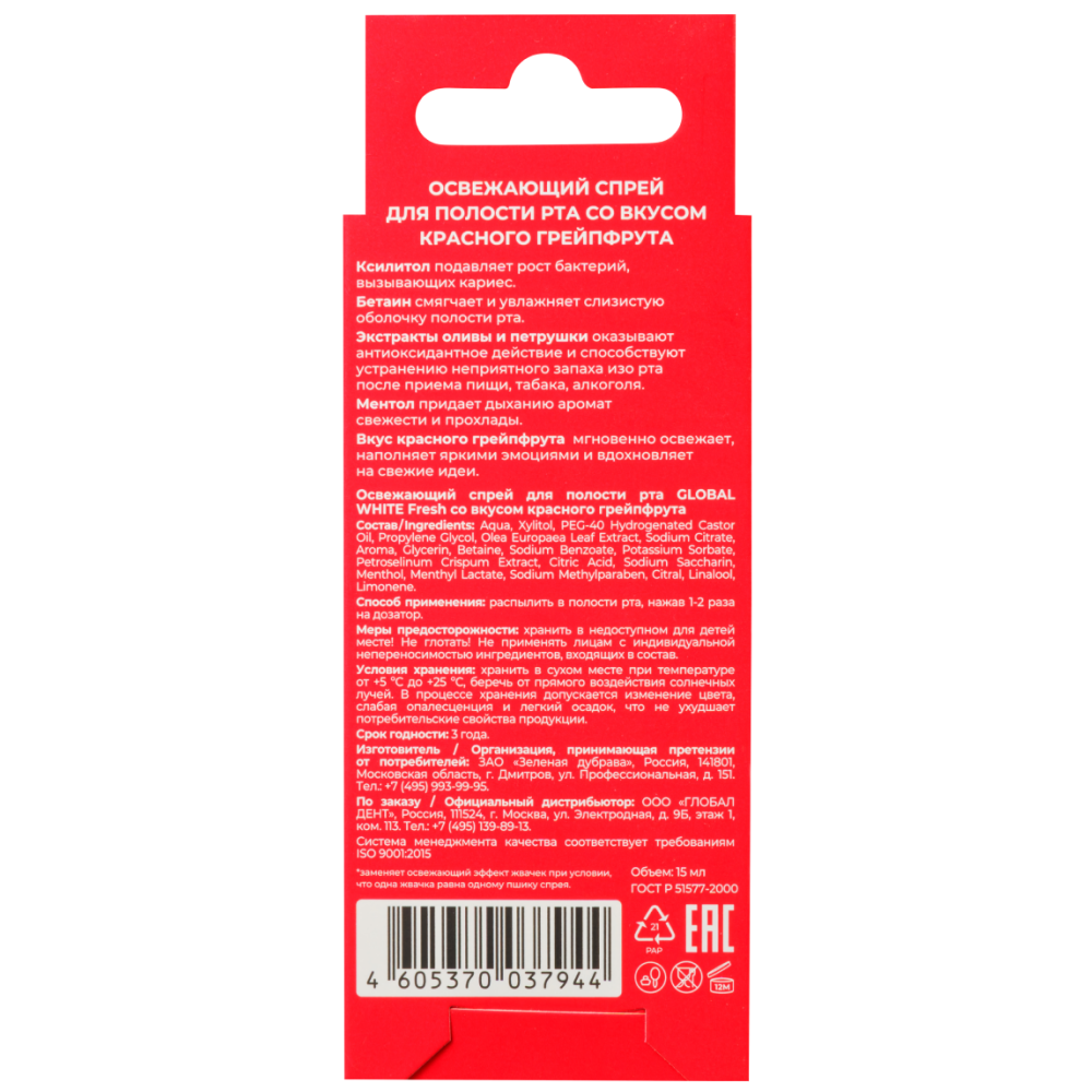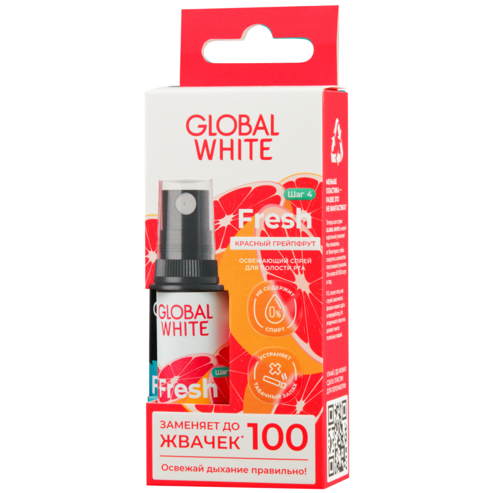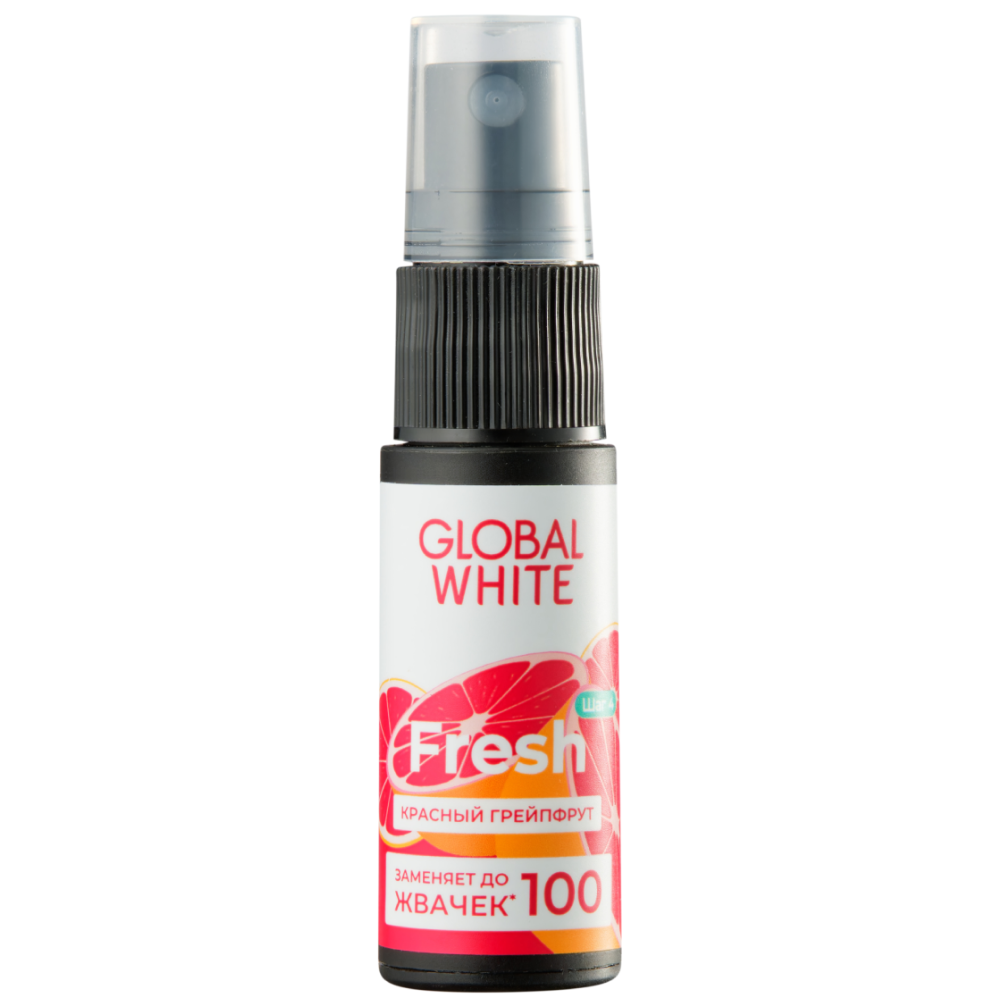 GLOBAL WHITE СПРЕЙ ДЛЯ ПОЛОСТИ РТА ОСВЕЖАЮЩИЙ FRESH СО ВКУСОМ КРАСНОГО ГРЕЙПФРУТА - Прозрачная жидкость со вкусом грейпфрута.