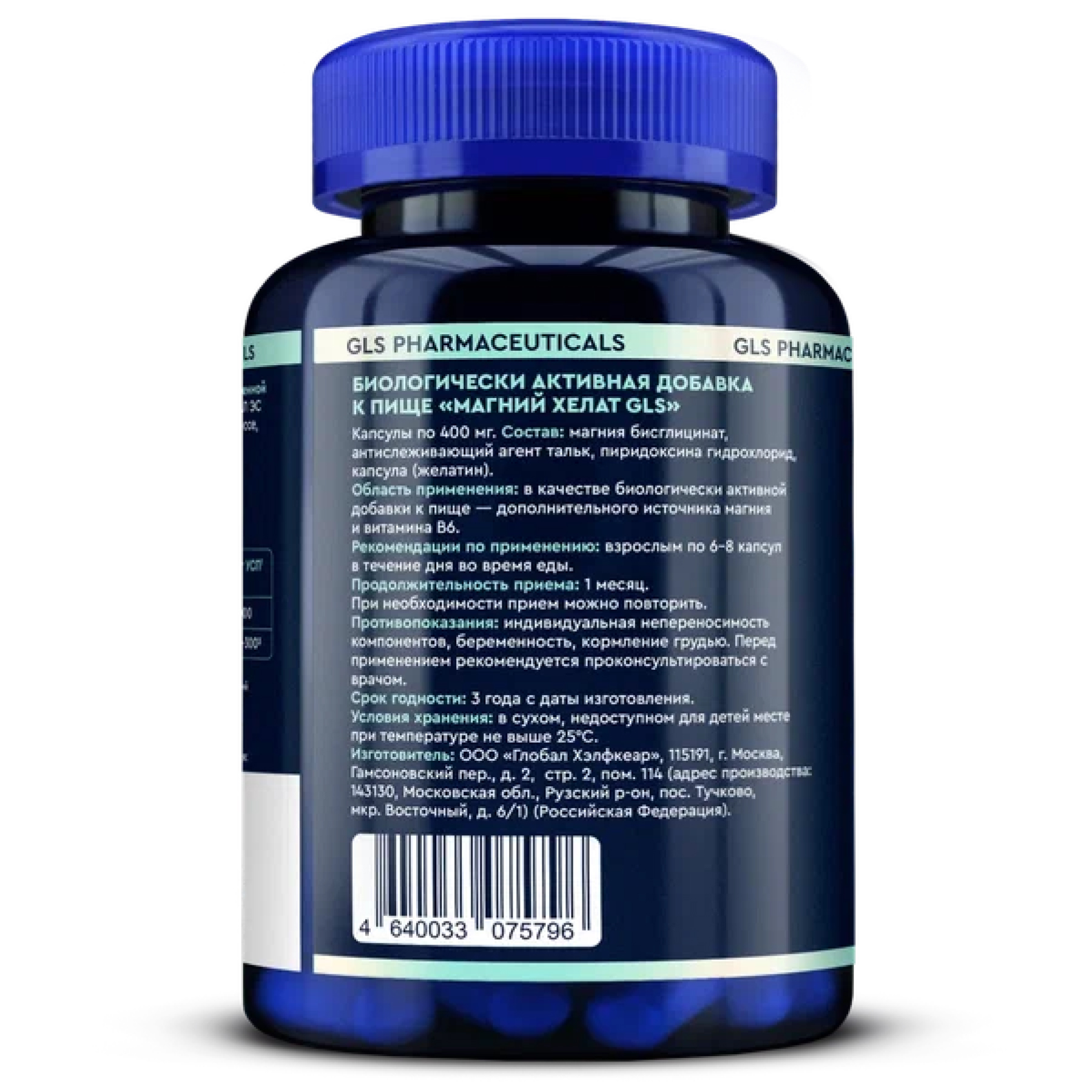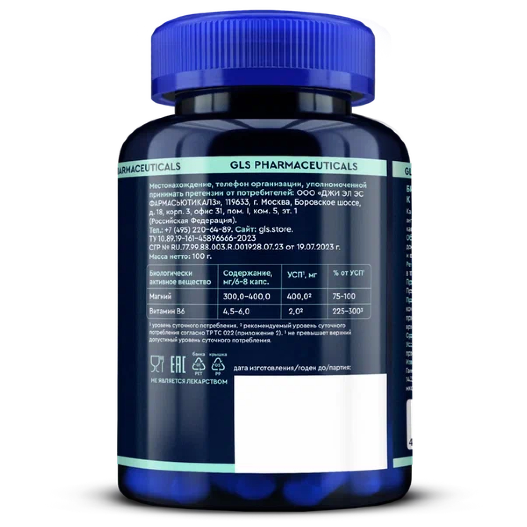 Магния бисглицинат, антислеживающий агент тальк, пиридоксина гидрохлорид, капсула (носитель гидроксипропилметилцеллюлоза или желатин).
