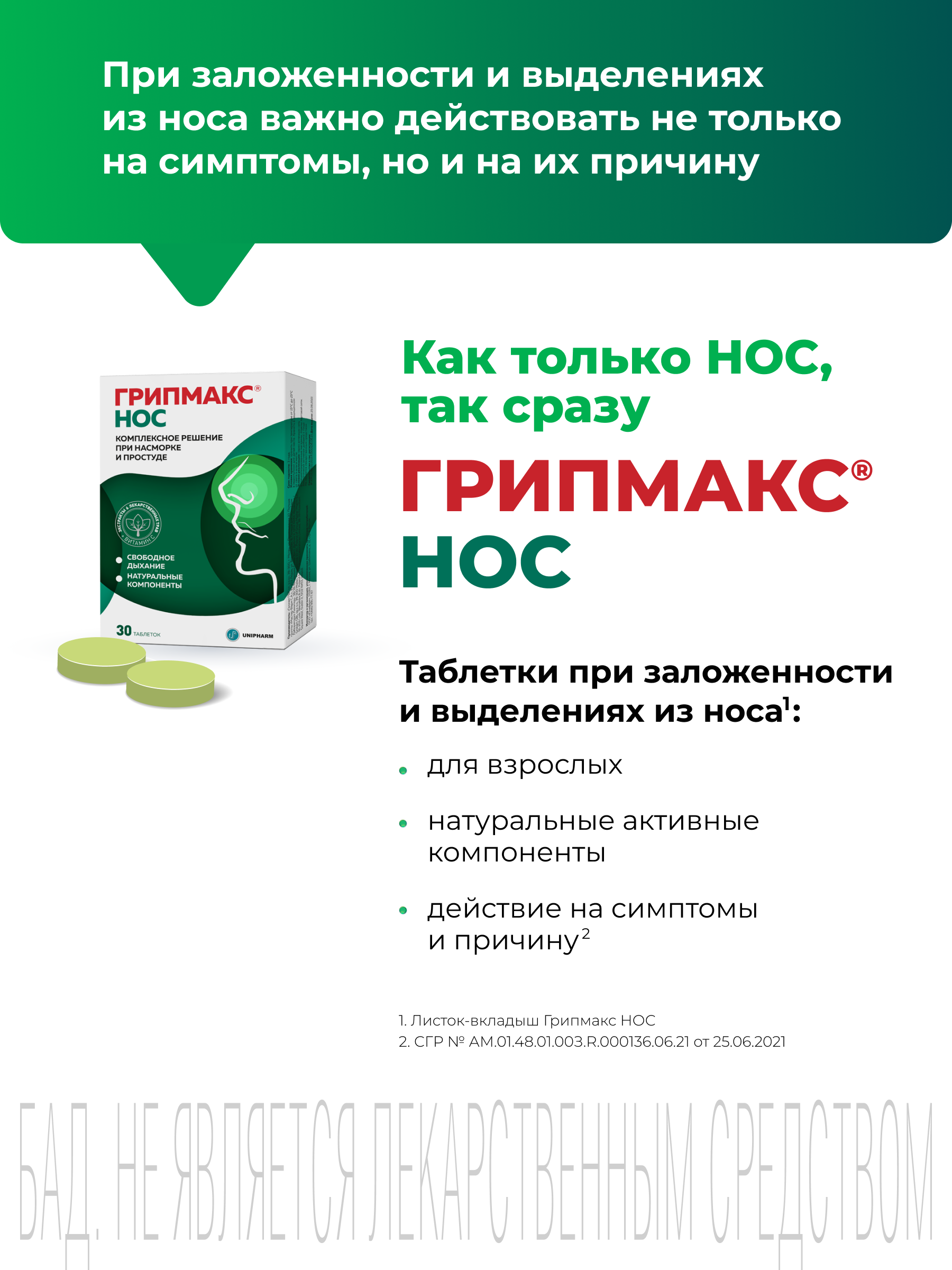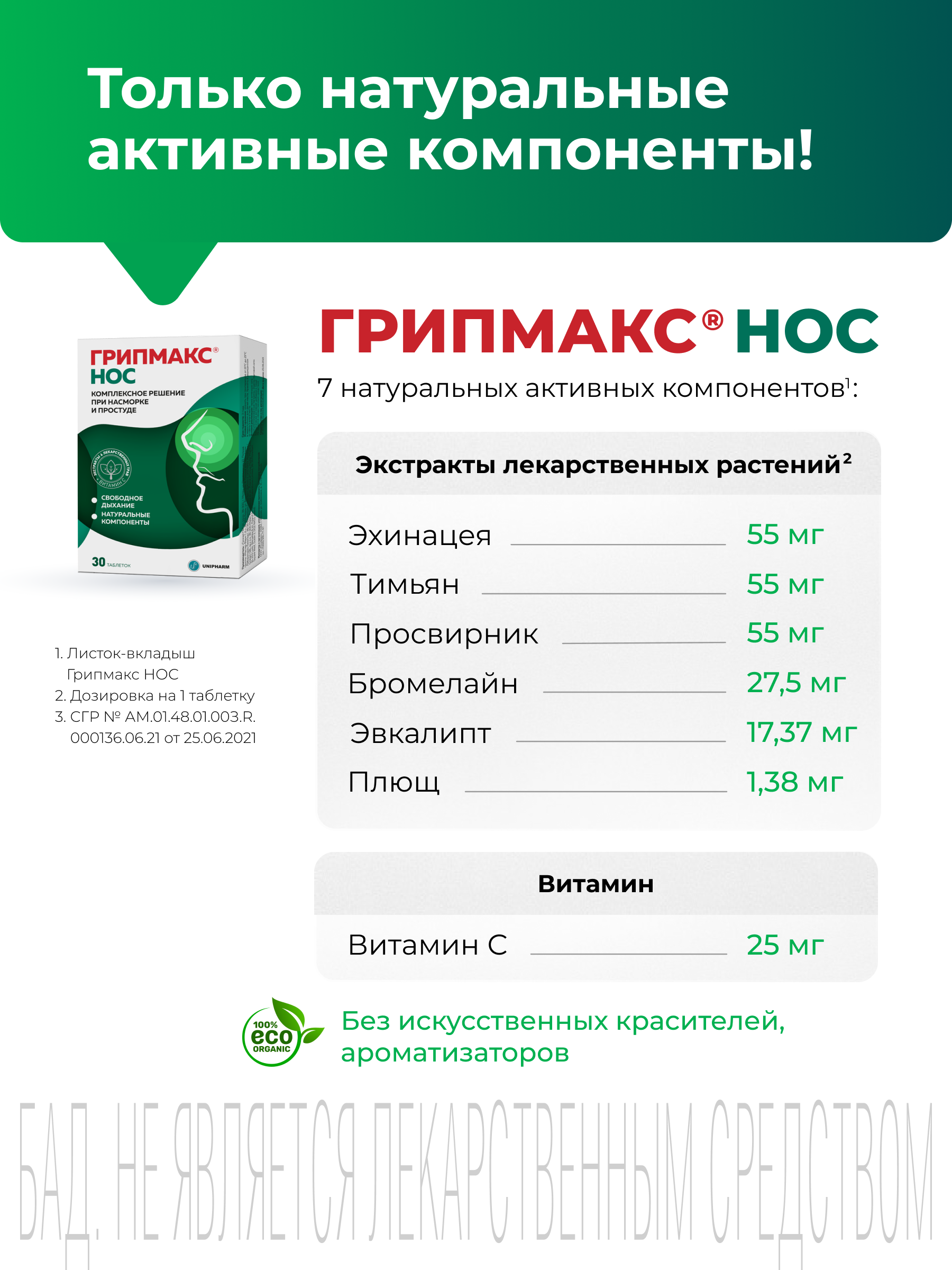 Комплексное средство с активными натуральными компонентами при заложенности и выделениях из носа. Грипмакс® Нос содержит 7 компонентов, которые способствуют:
