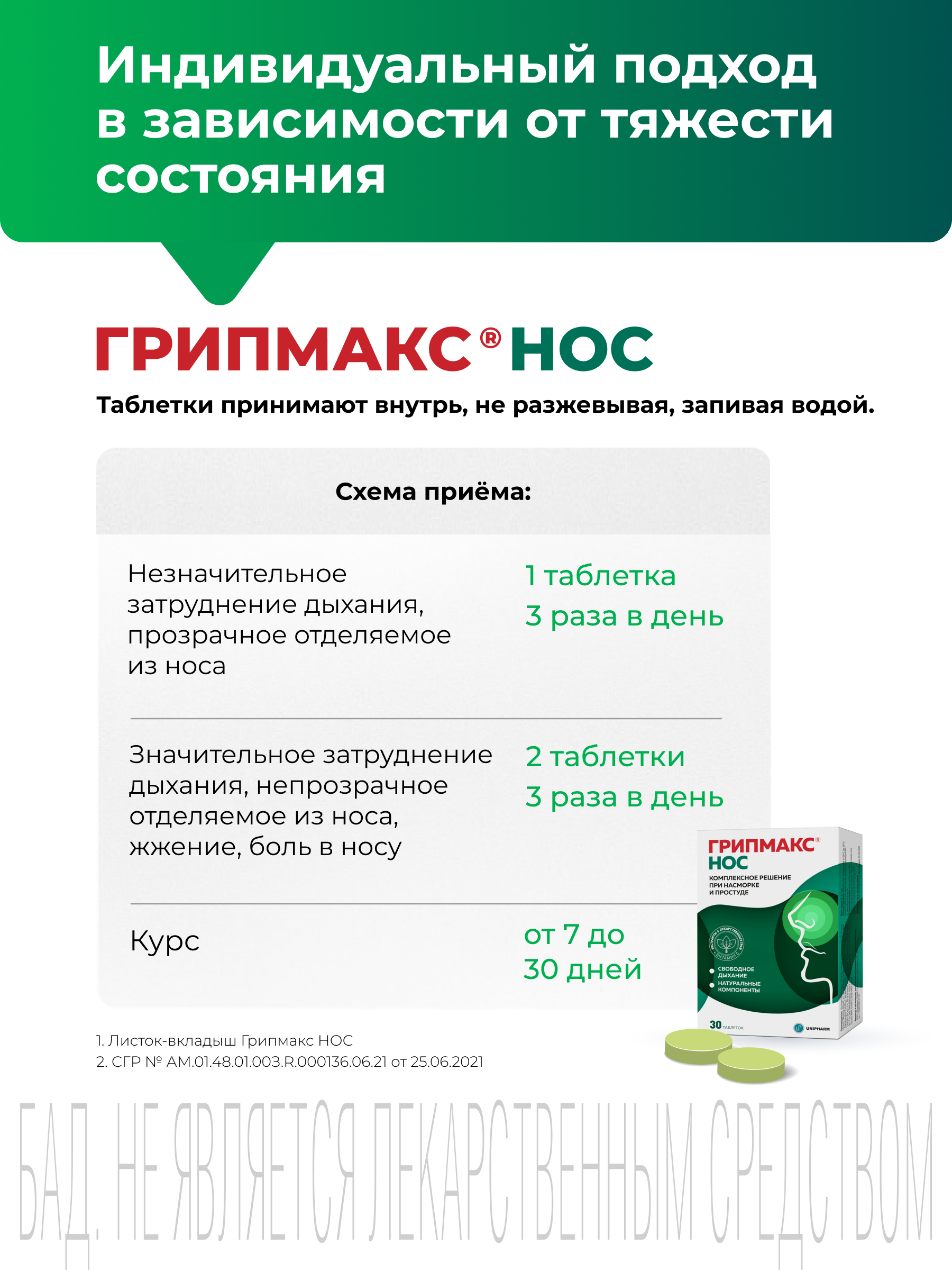| Заложенность носа, затруднение носового дыхания, непрозрачное отделяемое из носа, жжение в носу, боль или неприятные ощущения в области пазух носа | по 2 таб. 3 раза/сут |