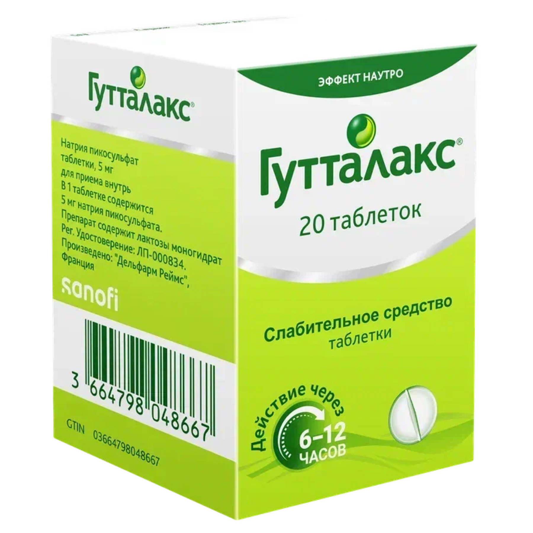 В рамках рандомизированного двойного слепого исследования в параллельных группах с участием 367 пациентов с хроническим запором исследовали влияние препарата Гутталакс®. Результаты исследования показали значимое усиление перистальтики кишечника в течение недели по сравнению с плацебо для всех 4 недель терапии (p<0.0001). Уровни концентрации сывороточного калия были неизменными к концу исследования (4.4мМ) и соответствовали физиологической норме (3.6-5.3 мМ).