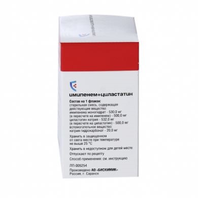 При в/м введении T1/2 имипенема - 2-3 ч. При в/в введении T1/2 имипенема и циластатина у взрослых - 1 ч, у детей 2-12 лет - 1-1.2 ч, у новорожденных T1/2 имипенема - 1.7-2.4 ч, циластатина - 3.8-8.4 ч; при нарушении функции почек T1/2 имипенема - 2.9-4 ч, циластатина - 13.3-17.1 ч.