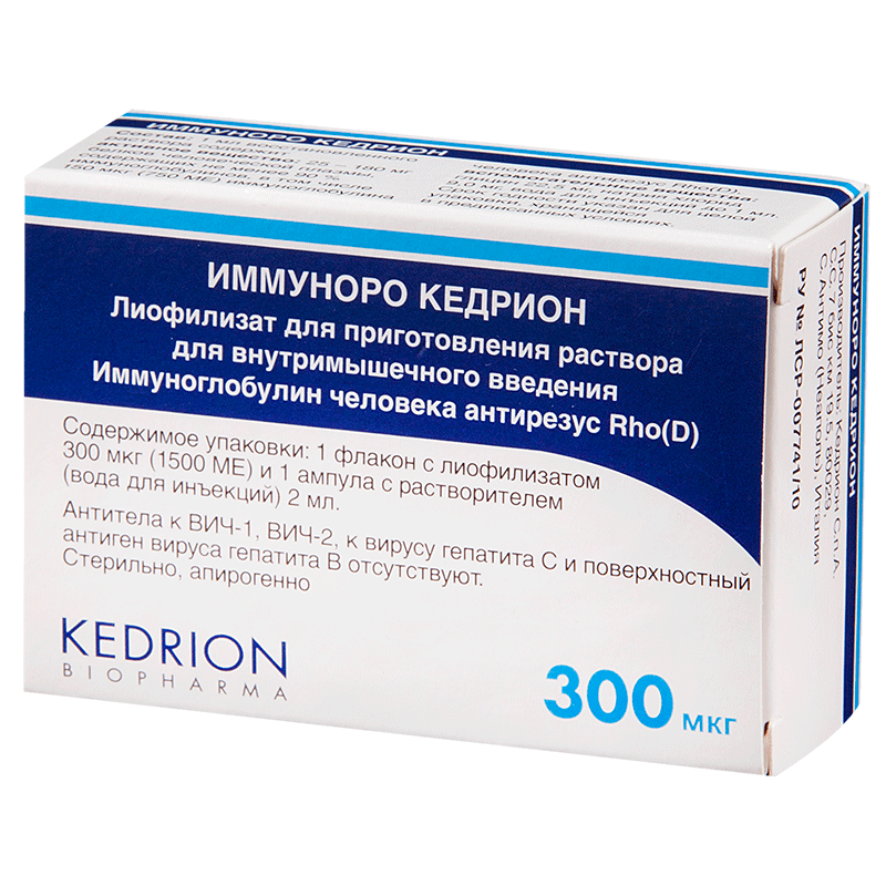 Иммуноглобулин. Активным компонентом препарата являются специфические антитела против Rh0(D)-антигена эритроцитов человека. Препарат предотвращает изоиммунизацию в резус-отрицательном организме женщины, в результате поступления крови плода в кровоток матери при рождении резус-положительного ребенка, при самопроизвольном и искусственном абортах, в случае проведения амниоцентеза или при получении травмы органов брюшной полости во время беременности.