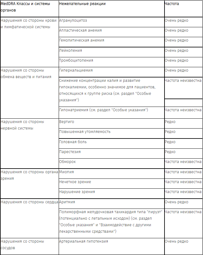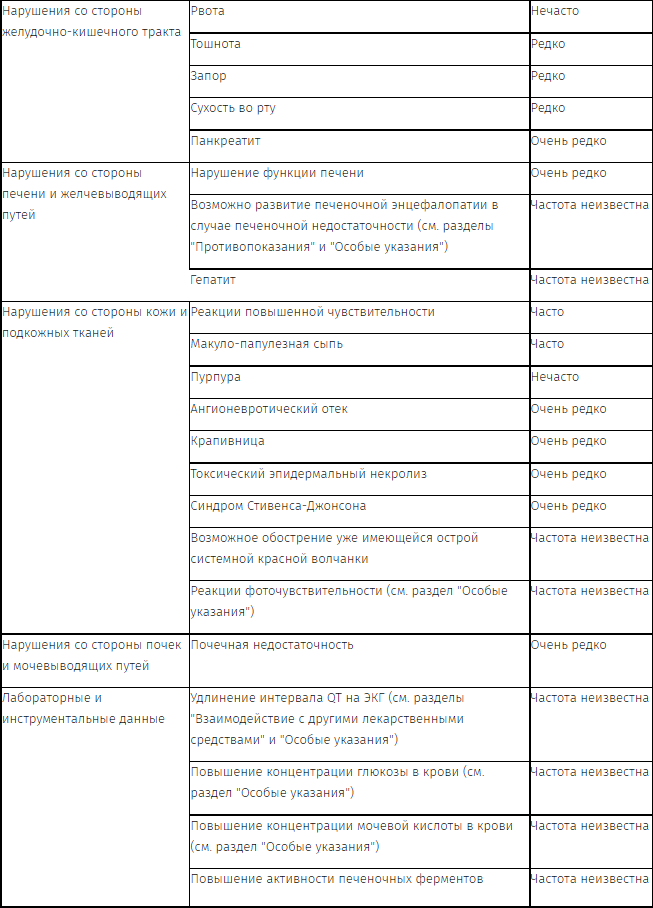 Частота побочных реакций, которые были отмечены во время терапии индапамидом, приведена в виде следующей градации: очень часто (≥1/10); часто (≥1/100, <1/10); нечасто (≥1/1000, <1/100); редко (≥1/10000, <1/1000); очень редко (≥1/10000); частота неизвестна (частота не может быть подсчитана по доступным данным).