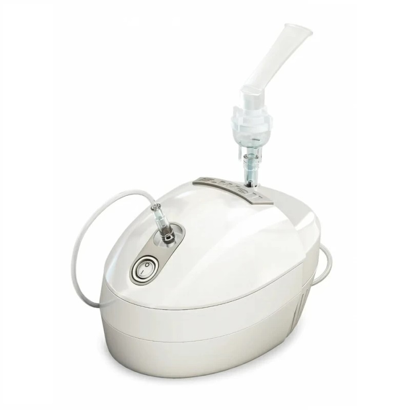 Компрессор подает мощный поток воздуха в специальную камеру. Сильная струя воздуха разбивает лекарственный препарат на сверхмалые частицы. В таком виде через маску или мундштук лекарственное средство поступает к пациенту в организм.
