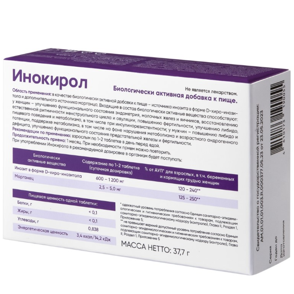 В одной таблетке Инокирола содержится Инозит в форме D-хиро инозитола 600 мг и марганец 2,5 мг.