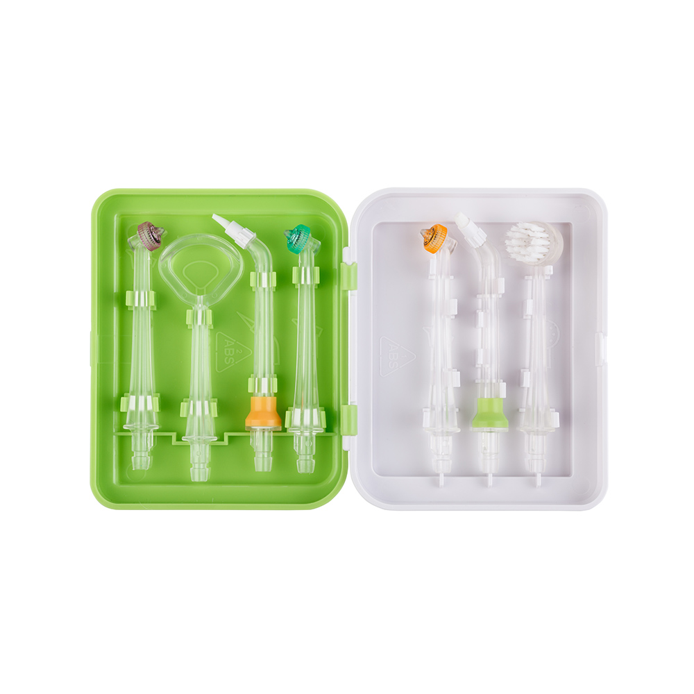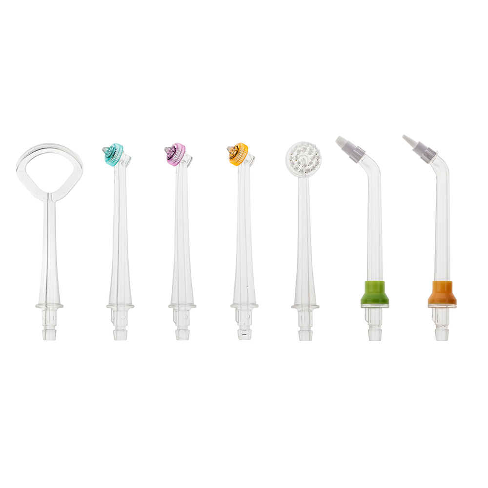 Стандартные насадки (3 шт.), ортодонтальная для брекетов (1 шт.), пародонтальная с мягким наконечником (1 шт.), насадка для чистки языка (1 шт.) и насадка-щетка для чистки зубов с использованием зубной пасты (1 шт.)