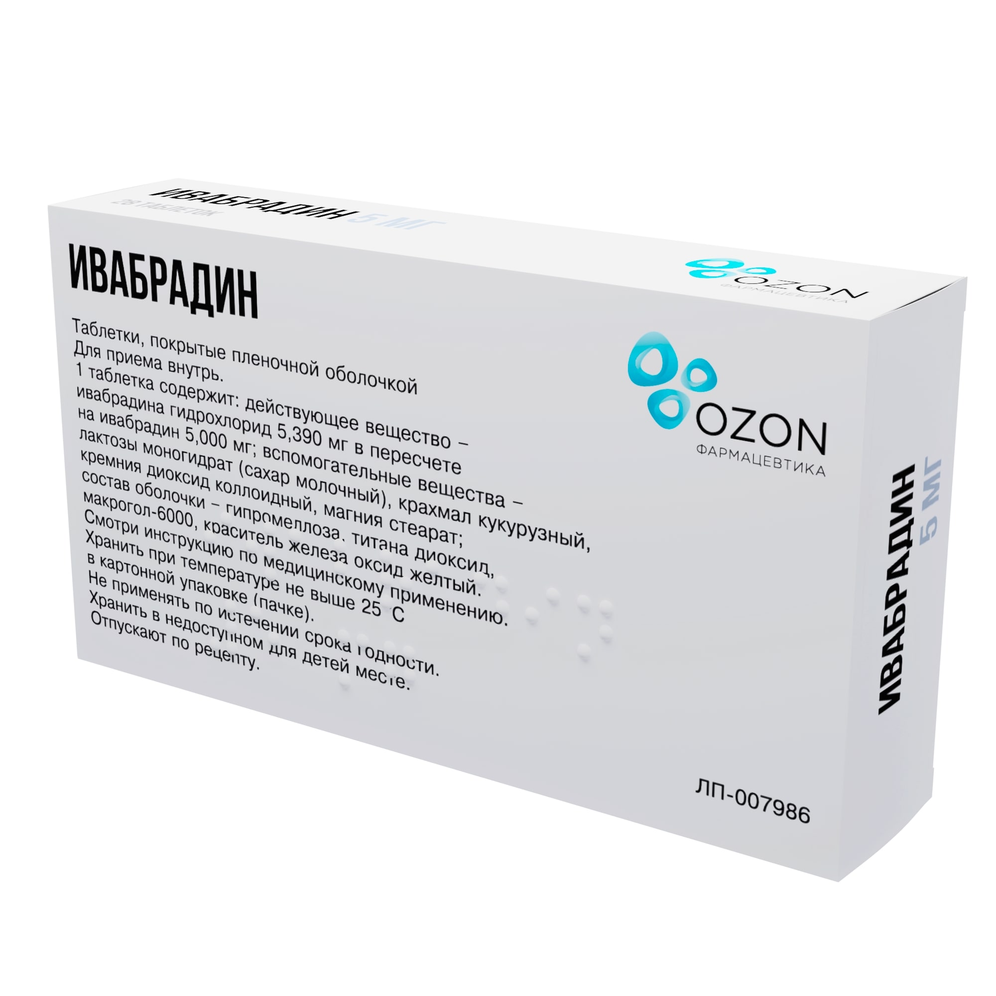 Действующее вещество: ивабрадина гидрохлорид - 5,390 мг, в пересчете на ивабрадин - 5,000 мг.
