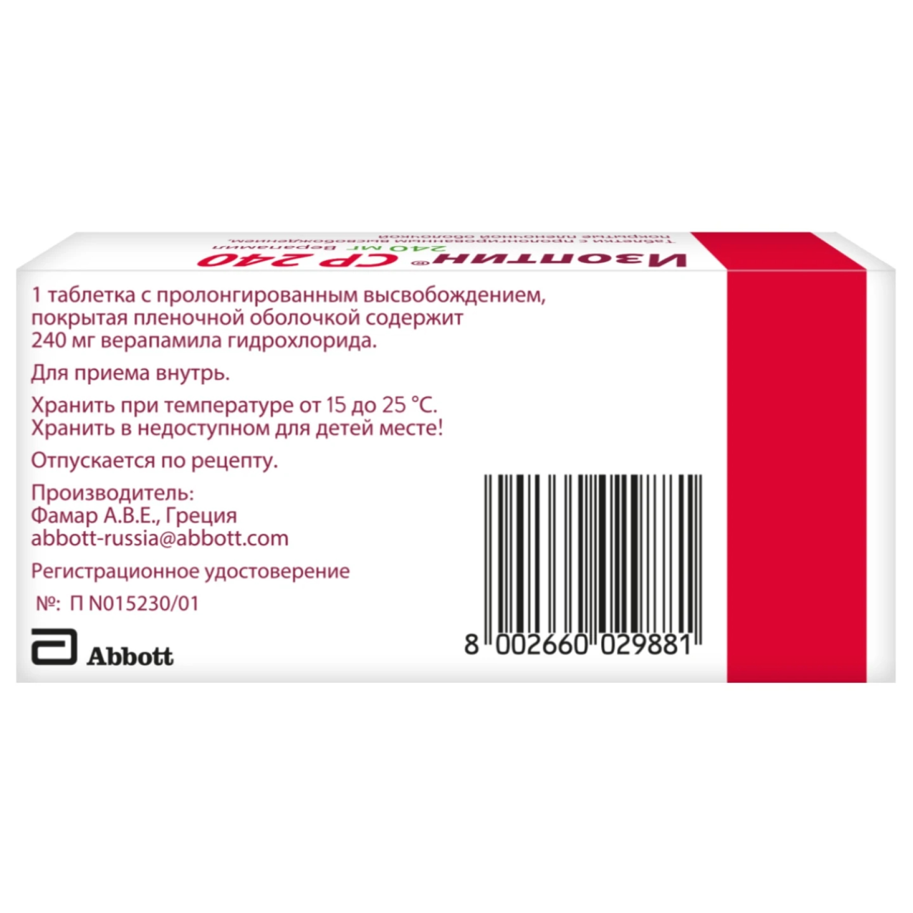 Действующее вещество: верапамила гидрохлорид 240,0 мг.