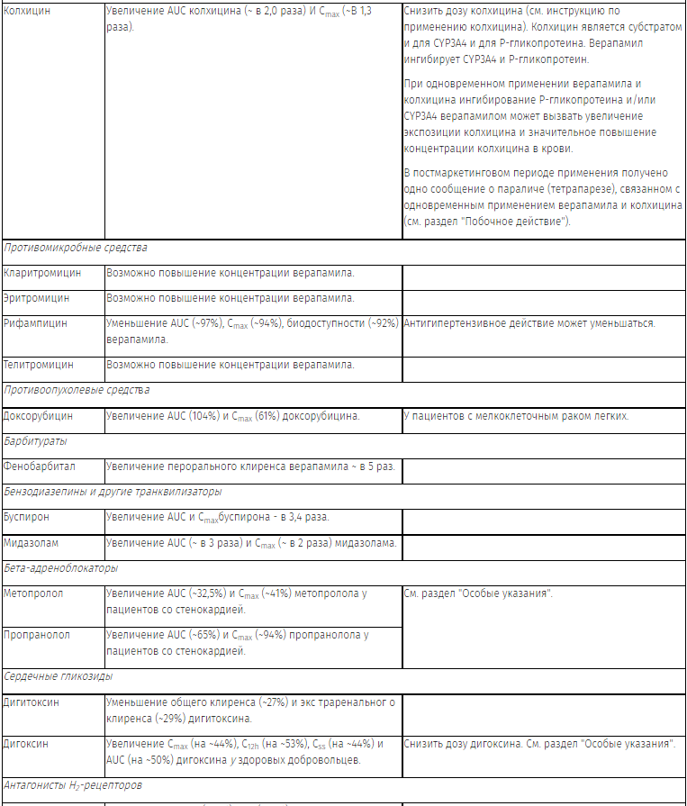 1 - в период пострегистрационного применения сообщалось о единичном случае развития паралича (тетрапареза), связанного с совместным применением верапамила и колхицина. Это могло быть связано с проникновением колхицина через гематоэнцефалический барьер вследствие подавления активности изофермента CYP3A4 и Р-гликопротеина под действием верапамила (см. раздел "Взаимодействие с другими лекарственными средствами").