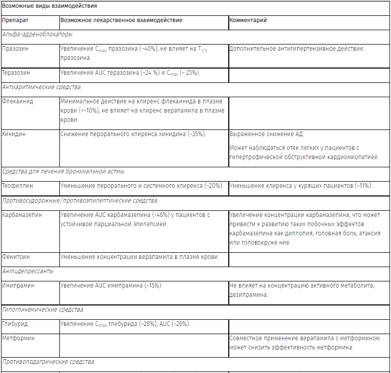 Взаимное усиление влияния на сердечно-сосудистую систему (атриовентрикулярная блокада высокой степени, значительное снижение ЧСС, обострение сердечной недостаточности и выраженное снижение АД). Бессимптомная брадикардия (36 уд/мин) с миграцией ритма по предсердиям наблюдалась у пациента, одновременно принимающего тимолол (бета-адреноблокатор) в форме глазных капель и верапамил внутрь.