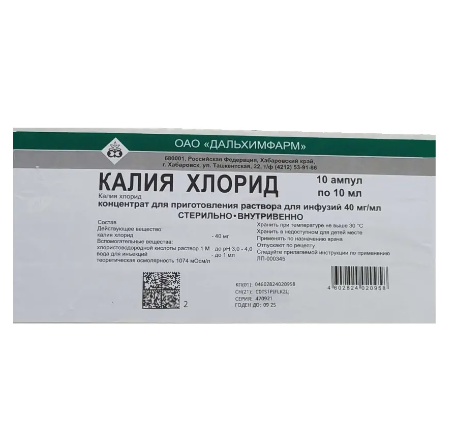 Для внутривенного капельного введения можно готовить раствор из расчета до 2,5 г калия хлорида в 500 мл изотонического 0,9% раствора натрия хлорида или 5% раствора декстрозы (глюкозы).