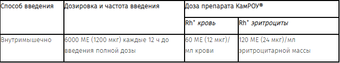 После переливания крови, несовместимой по резус-фактору, или попадания в кровоток большого количества крови плода в течение 72 ч следует ввести препарат КамРОУ® согласно приведенной ниже таблице: