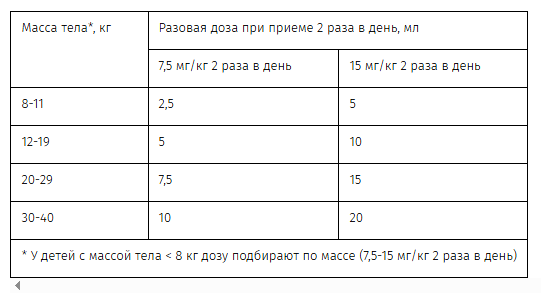 В таблице приведены рекомендации по дозированию у детей с учетом массы тела: