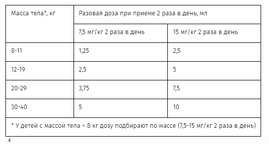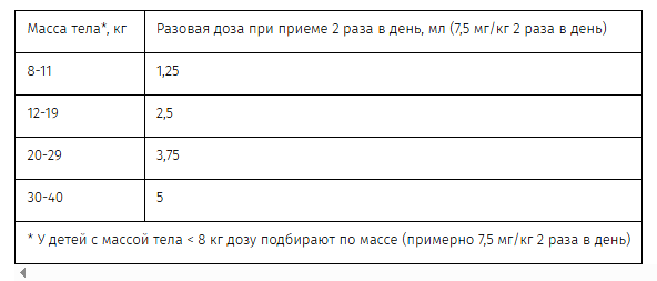 В таблице приведены рекомендации по дозированию у детей с учетом массы тела: