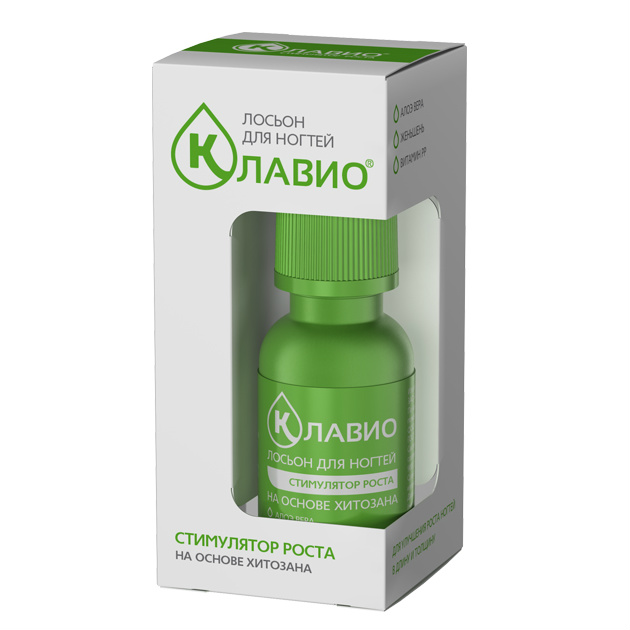 - Основой лосьона КЛАВИО является хитозан – биологический полимер, способствующий выравниванию структуры ногтевой пластины и защищающий ее от проникновения внешних агрессивных веществ и потери влаги.
