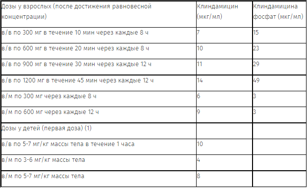 После введения 600 мг клиндамицина фосфата внутримышечно (в/м) максимальная концентрация клиндамицина в сыворотке крови (9 мкг/мл) достигается через 1-3 ч от момента введения. После внутривенной (в/в) инфузии 300 мг клиндамицина в течение 10 мин или 600 мг клиндамицина в течение 20 мин максимальная концентрация клиндамицина, которая составляет 7 мкг/мл и 10 мкг/мл, соответственно, достигается к окончанию введения клиндамицина. В таблице приведены средние максимальные концентрации клиндамицина и клиндамицина фосфата в сыворотке крови после его применения. Клиндамицина фосфат назначают взрослым через каждые 8-12 ч, детям - через каждые 6-8 ч, или в виде постоянной в/в инфузии, что обеспечивает концентрацию клиндамицина в сыворотке крови, которая превышает минимальную концентрацию препарата in vitro, необходимую для подавления наиболее чувствительных к клиндамицину микроорганизмов. Постоянный уровень клиндамицина в организме достигается после введения третьей дозы.