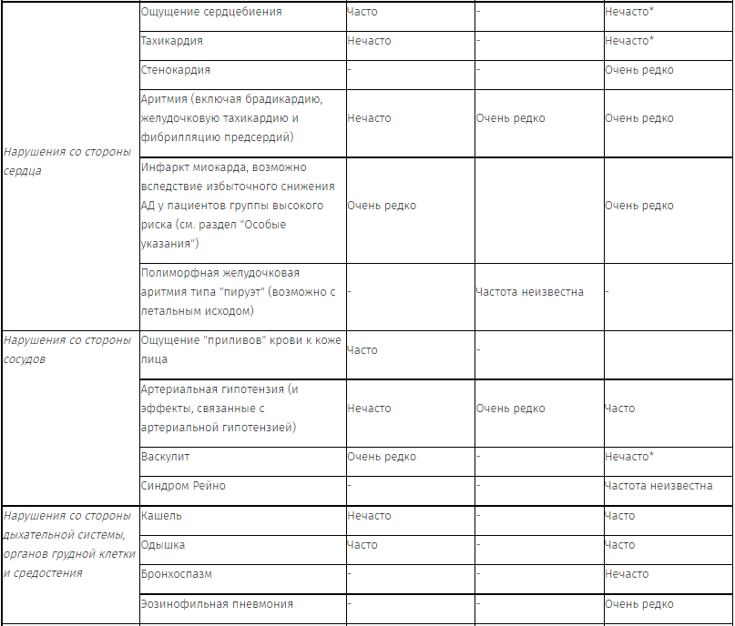 С осторожностью:Печеночная недостаточность легкой и средней степени тяжести, почечная недостаточность средней степени тяжести (КК 30-60 мл/мин), системные заболевания соединительной ткани (в том числе системная красная волчанка, склеродермия), двусторонний стеноз почечных артерий, аллергическая реакция на пенициллин в анамнезе, терапия иммунодепрессантами, аллопуринолом, прокаинамидом (риск развития нейтропении и агранулоцитоза), одновременное применение с лекарственными средствами, способными вызывать полиморфную желудочковую тахикардию типа "пируэт", одновременное применение с калийсберегающими диуретиками, препаратами калия и лития, одновременное применение препаратов, удлиняющих интервал QT, гиперкалиемия, угнетение костномозгового кроветворения, сниженный объем циркулирующей крови (ОЦК) (прием диуретиков, диета с ограничением поваренной соли, рвота, диарея, гемодиализ), ишемическая болезнь сердца (ИБС), нестабильная стенокардия (за исключением стенокардии Принцметала), атеросклероз, цереброваскулярные заболевания, реноваскулярная гипертензия, сахарный диабет, ХСН (III-IV функциональный класс по классификации NYHA), острый инфаркт миокарда (в течение 1 месяца после инфаркта миокарда), синдром слабости синусового узла, нарушение водно-электролитного баланса, применение у пациентов с удлинением интервала QT на электрокардиограмме (ЭКГ), гиперурикемия (особенно в сочетании с подагрой и уратным нефролитиазом), гиперпаратиреоз, одновременное применение дантролена, эстрамустина, одновременное применение с индукторами и/или ингибиторами изофермента CYP3A4, хирургическое вмешательство/общая анестезия, лабильность АД, проведение гемодиализа с использованием высокопроточных мембран (например, AN69®), перед процедурой афереза липопротеинов низкой плотности (ЛПНП) с помощью декстран сульфата, одновременное проведение десенсибилизирующей терапии аллергенами (например, ядом перепончатокрылых), состояние после трансплантации почки, аортальный стеноз, митральный стеноз, гипертрофическая обструктивная кардиомиопатия (ГОКМП), врожденный дефицит глюкозо-6-фосфатдегидрогеназы, применение у пациентов пожилого возраста и у пациентов негроидной расы.