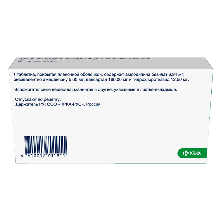 Действующие вещества: амлодипина безилат (амлодипина бесилат) 6,94 мг, эквивалентно амлодипину 5,00 мг, Валсартан А, субстанция-гранулы 251,35 мг [Действующее вещество субстанции-гранул: валсартан 160,00 мг, вспомогательные вещества субстанции-гранул: целлюлоза микрокристаллическая, кроскармеллоза натрия, повидон, натрия лаурилсульфат], гидрохлоротиазид 12,50.