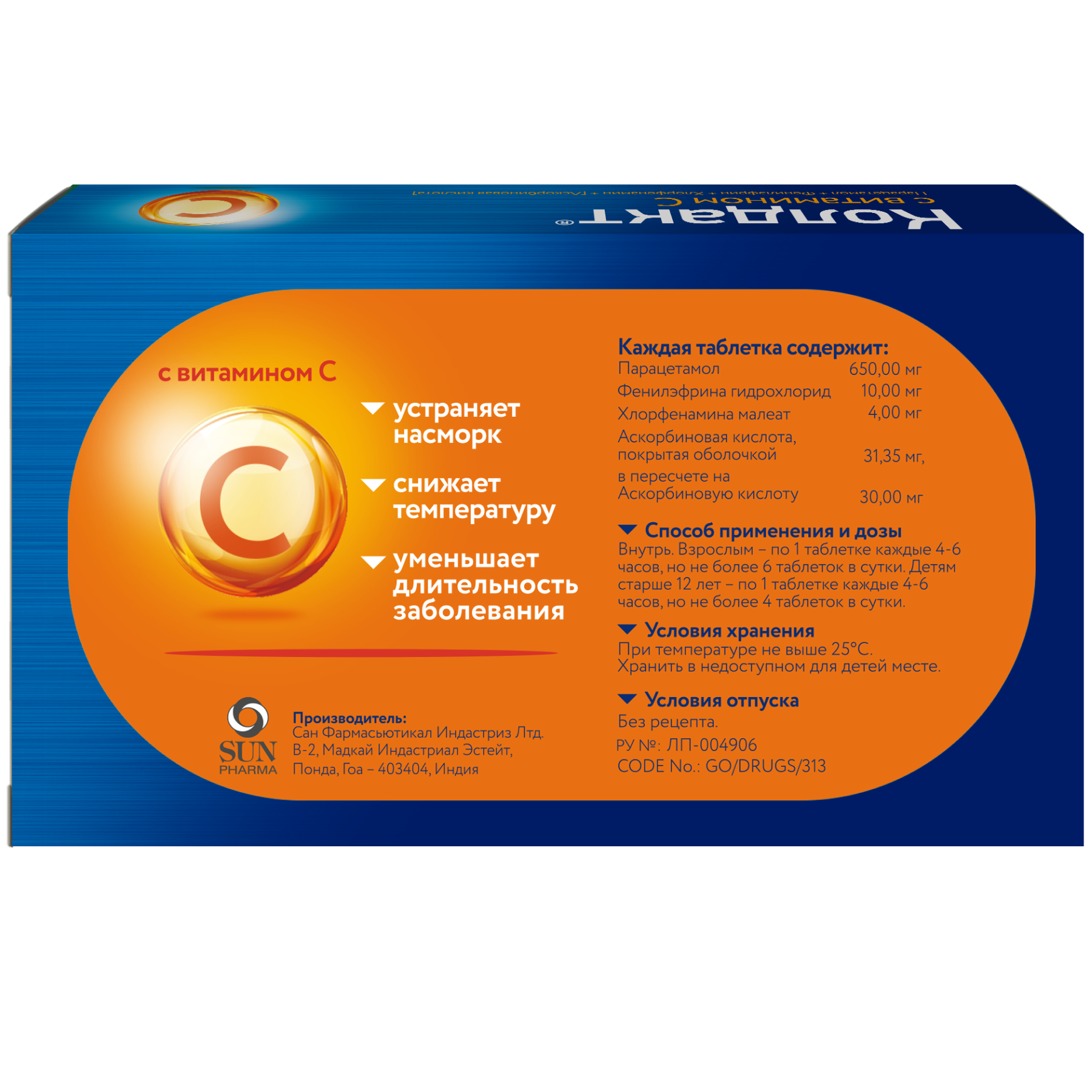 Аскорбиновая кислота (витамин С). Восполняет повышенную потребность в витамине С при простудных заболеваниях и гриппе, особенно на начальных стадиях заболевания. Повышает сопротивляемость организма к инфекциям, улучшает переносимость парацетамола. Участвует в различных биохимических реакциях окисления-восстановления. Является эффективным антиоксидантом. Прием аскорбиновой кислоты смягчает течение заболевания и укорачивает его длительность.