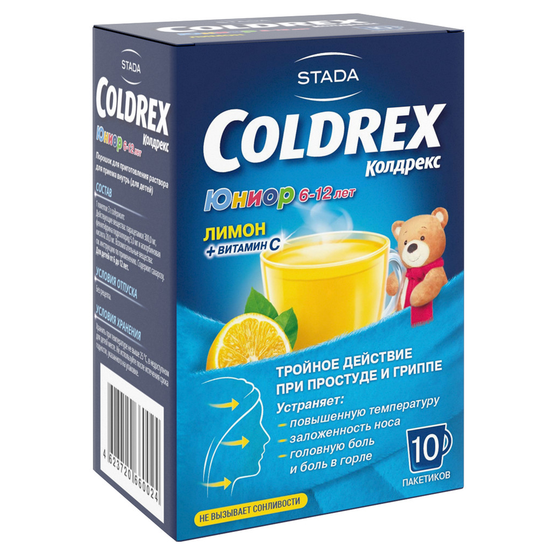 Минимальный интервал между приемами препарата Колдрекс Юниор должен составлять не менее 4 ч.