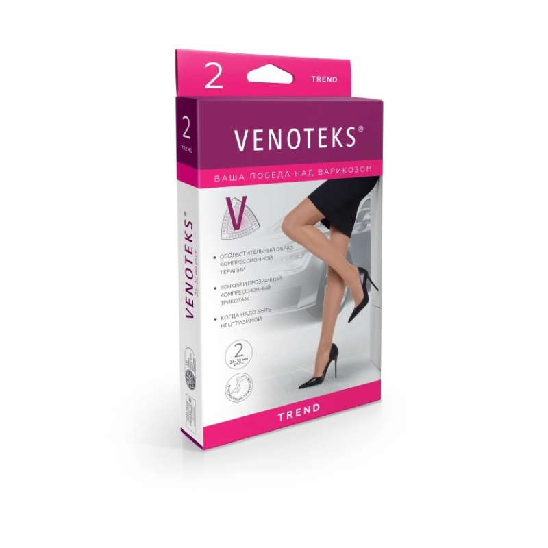 VENOTEKS TREND – эффективно снимают дневные отеки при статических нагрузках, уменьшают ночные судороги в ногах (венозного происхождения) и препятствуют дальнейшему прогрессированию варикозной болезни и развитию её осложнений.