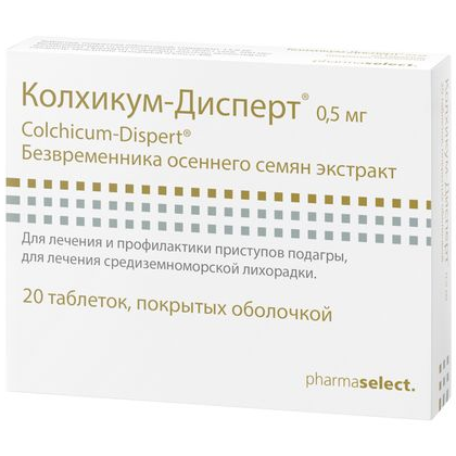 Колхицин быстро и интенсивно всасывается из ЖКТ. Средняя Cmax в плазме крови составляет 4.2 нг/мл и достигается примерно через 70 мин после приема в дозе 1 мг. T1/2 составляет 9.3 ч. Колхицин быстро проникает в ткани, имеет высокий Vd 473 л. Высокие концентрации колхицина обнаруживаются в печени, почках, селезенке, лейкоцитах и ЖКТ. Колхицин метаболизируется в печени и выводится главным образом с желчью.